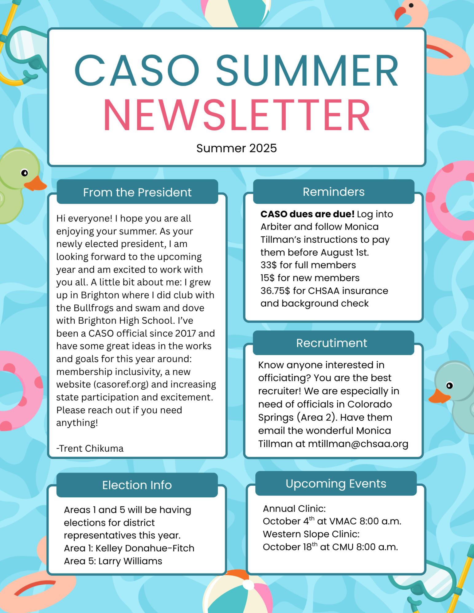 online voting process.In order to be eligibile for postseason officiating, you must have:1. Scored 80% or higher on the open book test2. Officiated a minimum of 6 meets during the season, subject to exceptions to be considered by the board of directors. May be modified as necessary to ensure a pool of highly qualified officials.3. Paid your annual CASO membership dues and be a member in good standing with the organization.4. Meet the deadline to apply for the state meet.5. Attended the required annual Swim/Dive clinic, unless excused by state or district chairs. View all required video classes.6. Consistently applied and implemented National Federation rules and CHSAA rule modifications of the sport, including official's uniform code.7. Three full year’s prior certification as a patched CASO or NFHS certified official. An official transferring to Colorado from another NFHS state or region is not required to the same years of service requirement as new officials.
